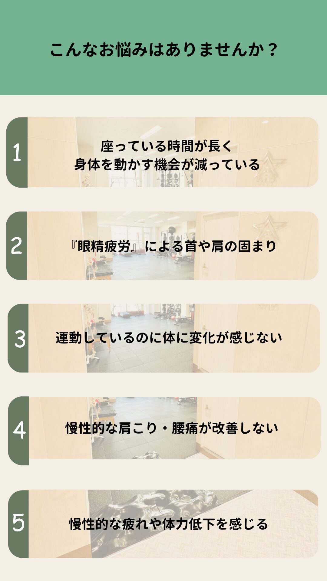 当施設にはリハビリ・治療からトレーニングにおける各分野の専門家がいます。まずはご相談ください。なお、当施設で診断は出来かねるため、ご相談内容によっては医療機関を推奨する場合もございます。