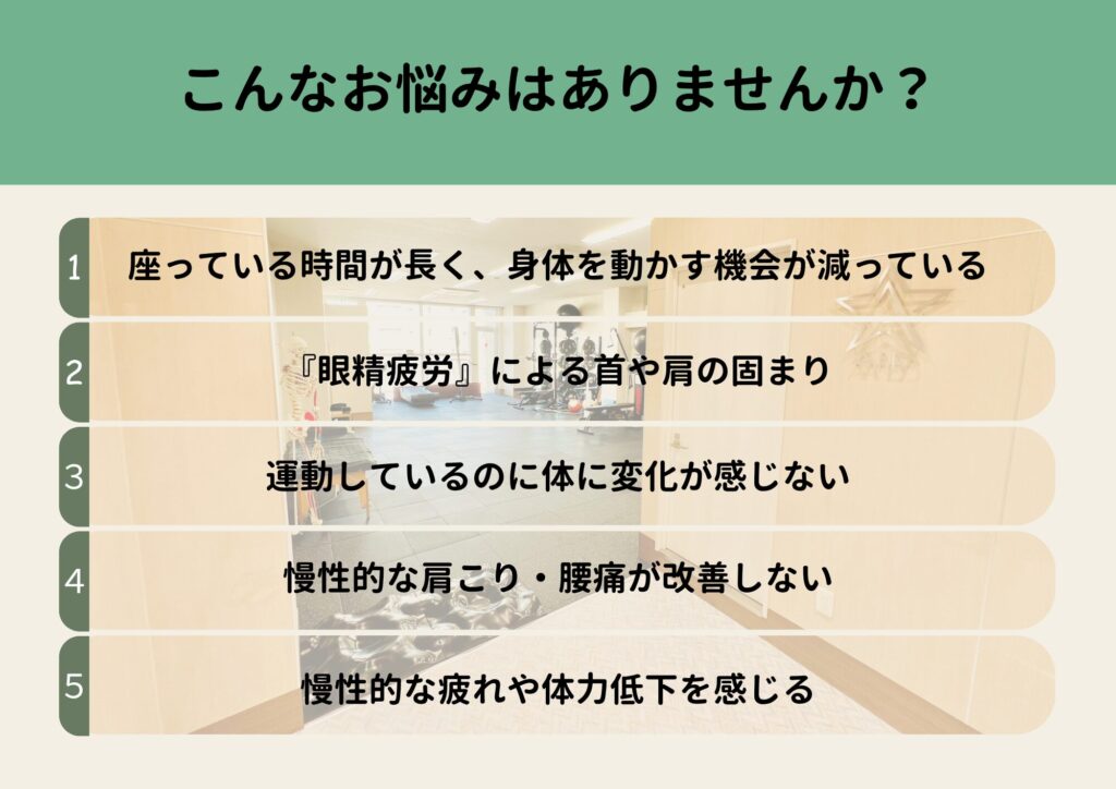 一人ひとりの姿勢や身体の状態を確認し、今のあなたに合ったメニューをご提供します。